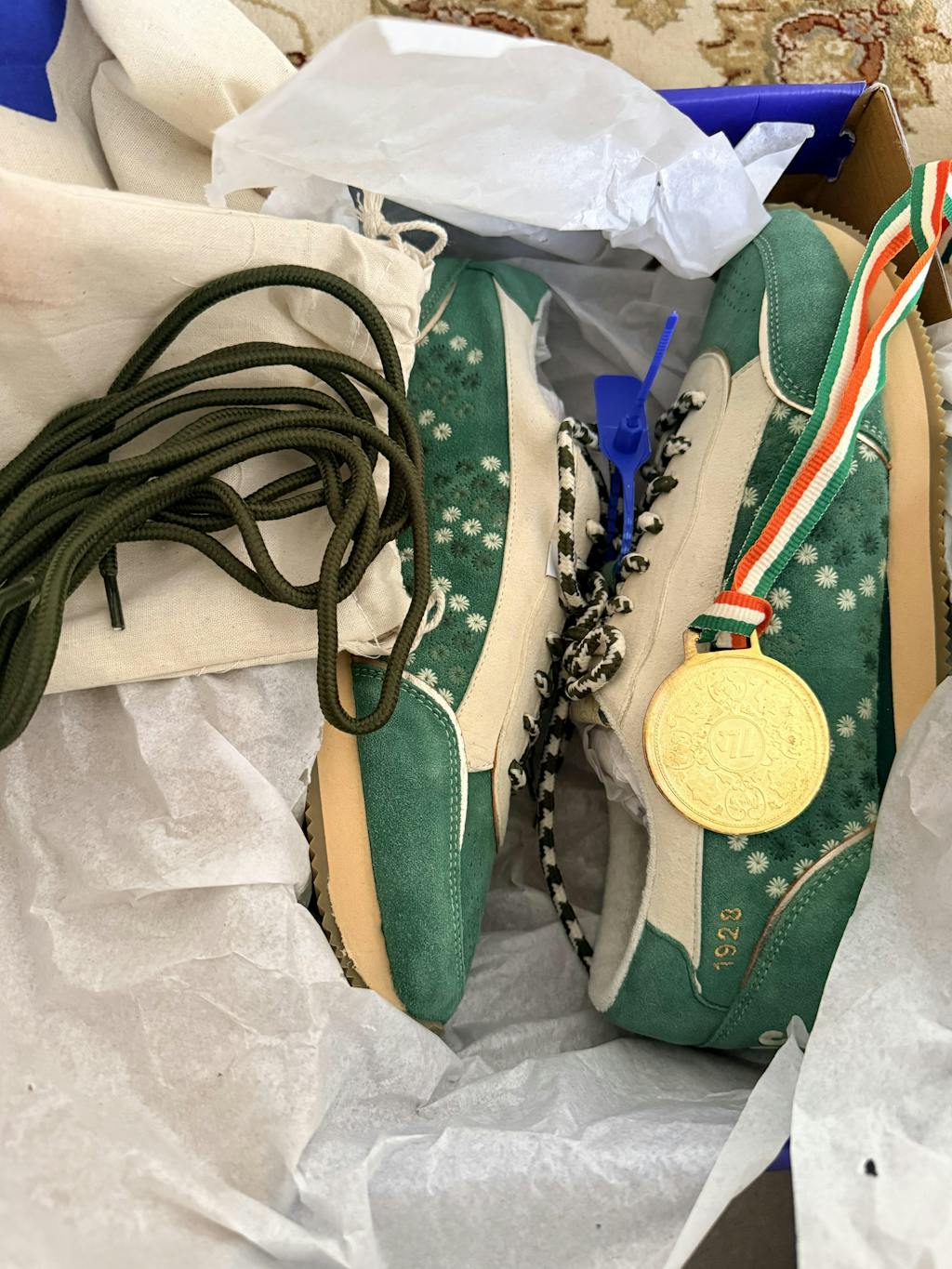 A tribute to India’s first year of Olympic hockey domination, this pair takes inspiration from the olive Olympic turf.