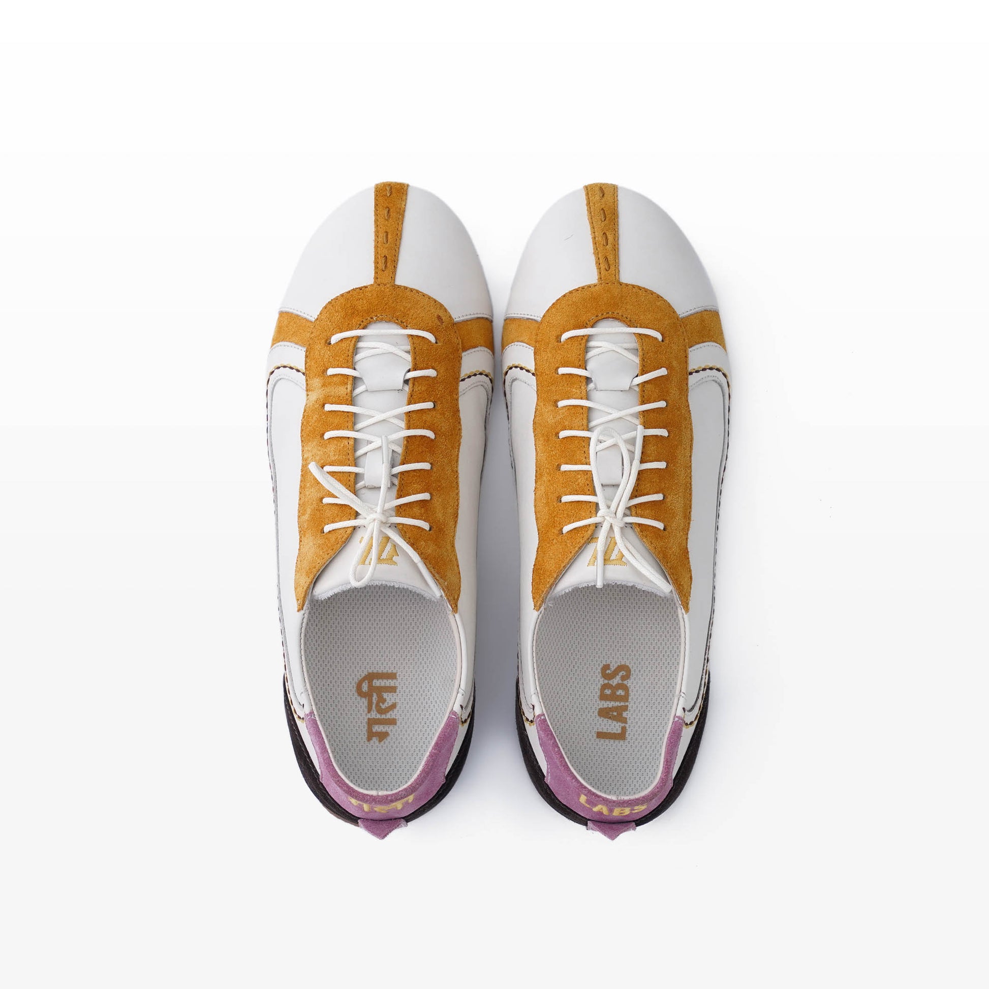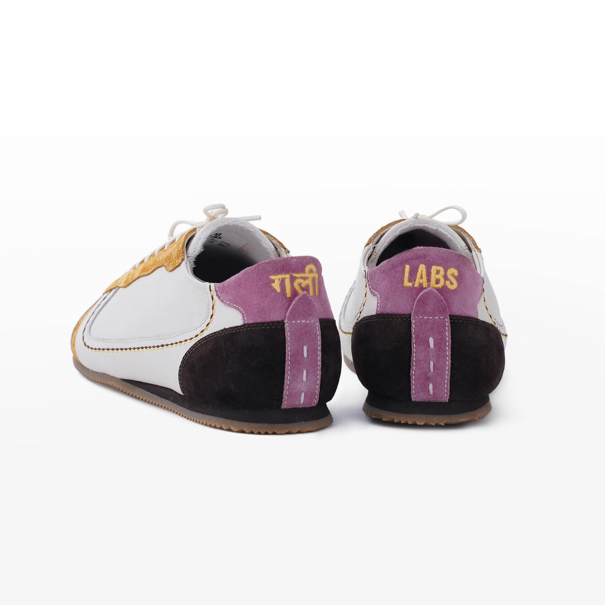 • Full grain leather upper in matte white with yellow, pink and brown suede accents